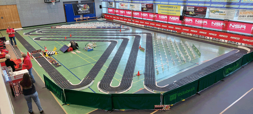 317 Meter lange, 2-spurige NINCO Rennbahn in der Wasenhalle in Ittersbach